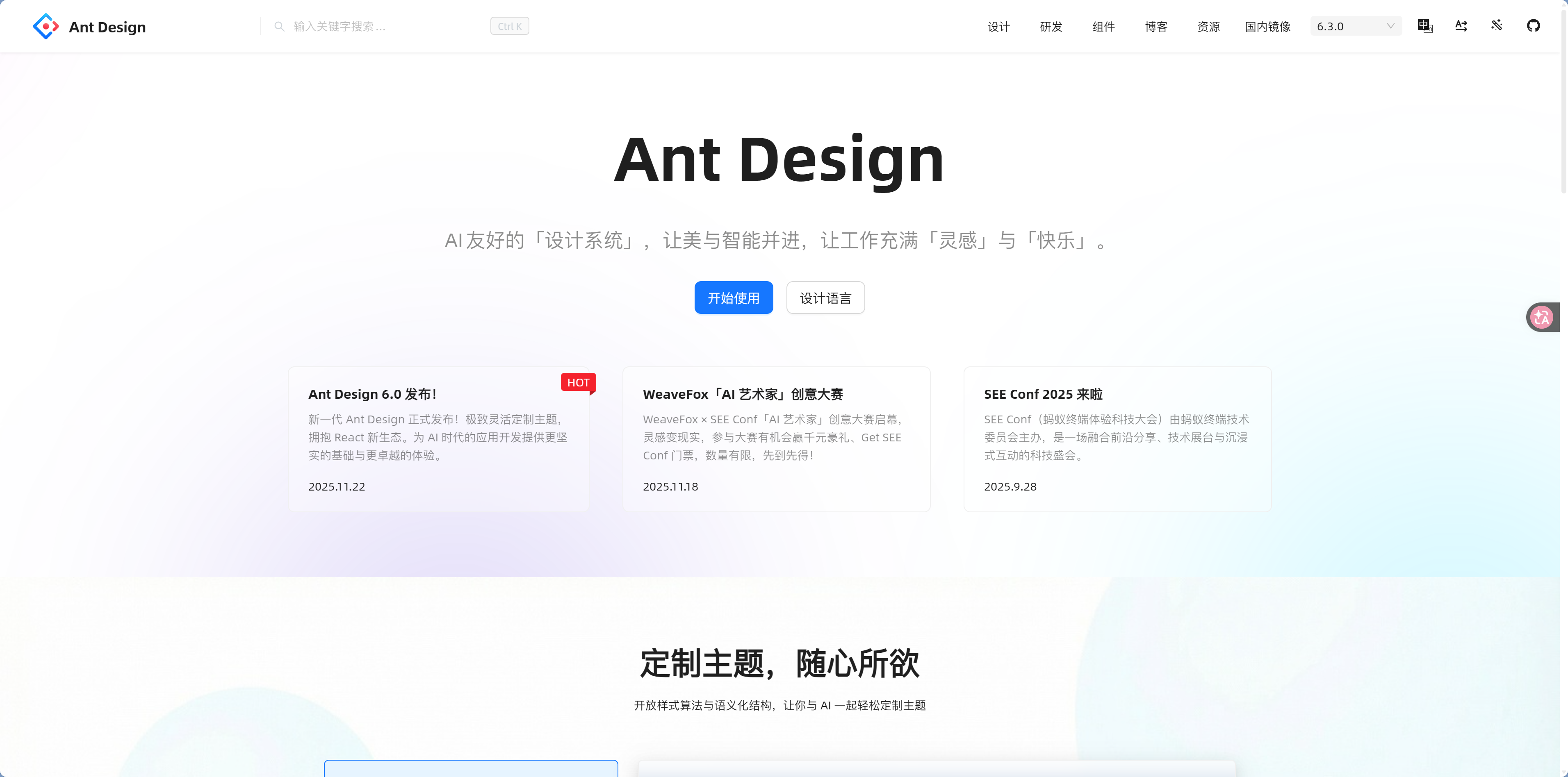 基于 Google Material Design 规范的第三方 React 组件库,全球使用最广泛,主题定制能力强。
