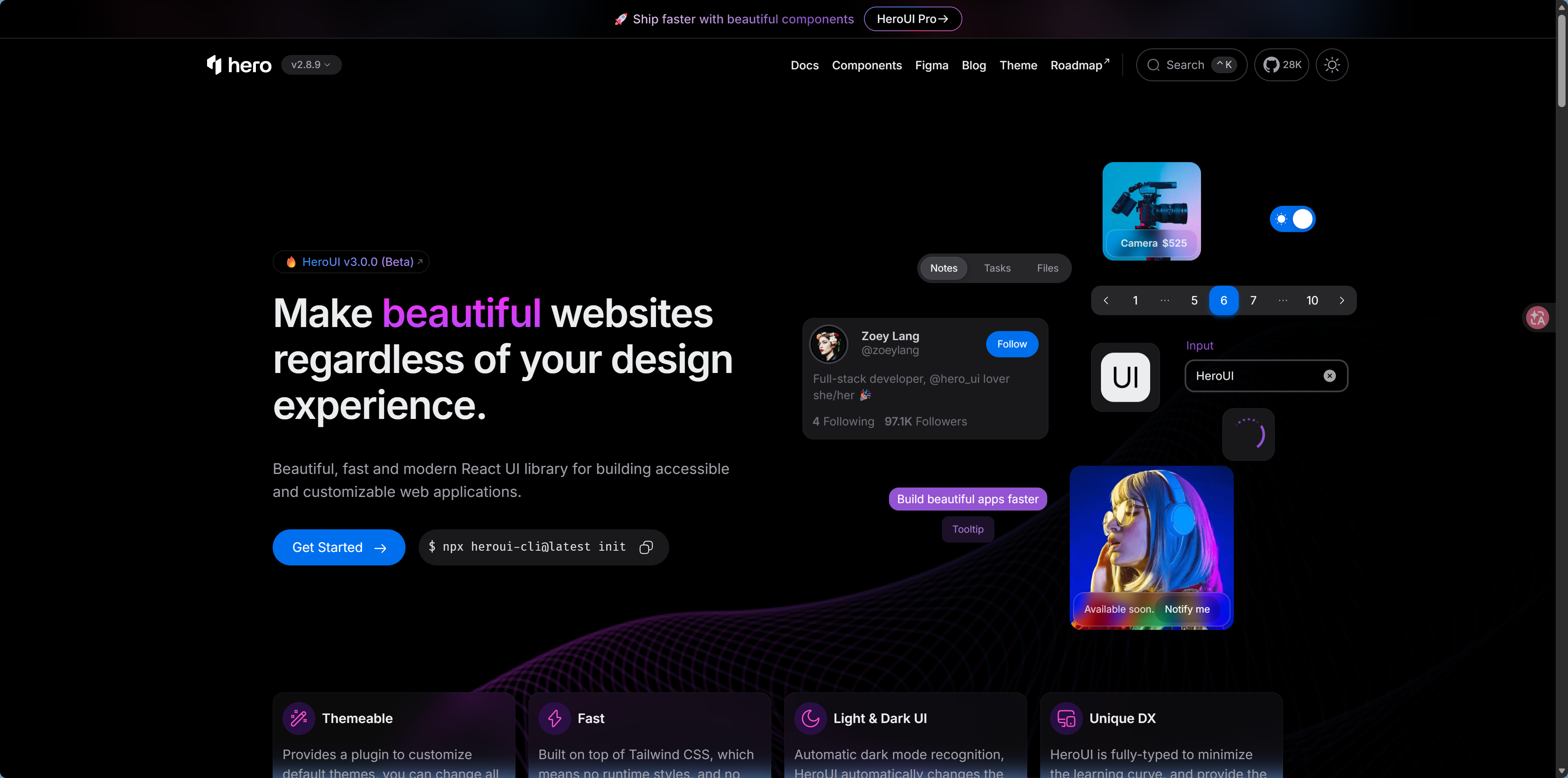原名 NextUI,基于 Tailwind CSS,开箱即用就好看,内置动画效果。