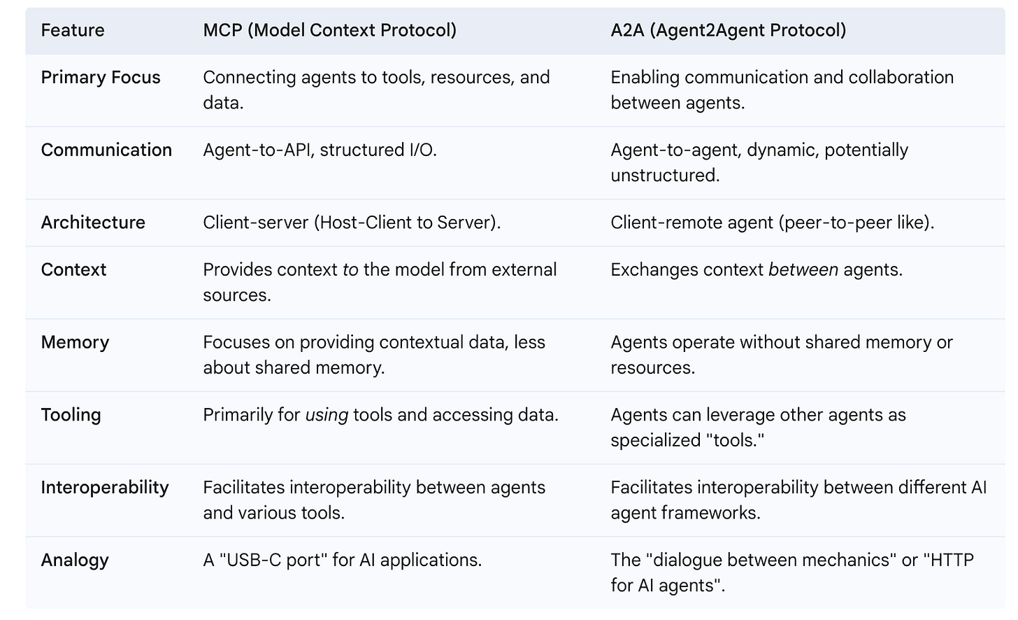 简单来说:MCP 将 Agent 连接到工具(想想 Agent 到 API),而 A2A 使 Agent 能够与其他 Agent 对话。