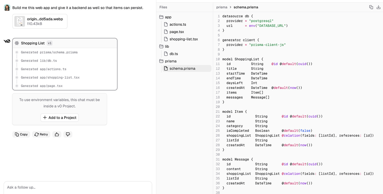 我经常先给 v0 一个参考稿——要么上传图片,要么直接喂 Figma 设计——再通过几轮提示,把交互细化到我满意的程度。如果你愿意把设计往后放,纯文本提示也能起步。若原型需要持久化能力,v0 也能配合 Prisma 一类方案把数据模型先搭起来。