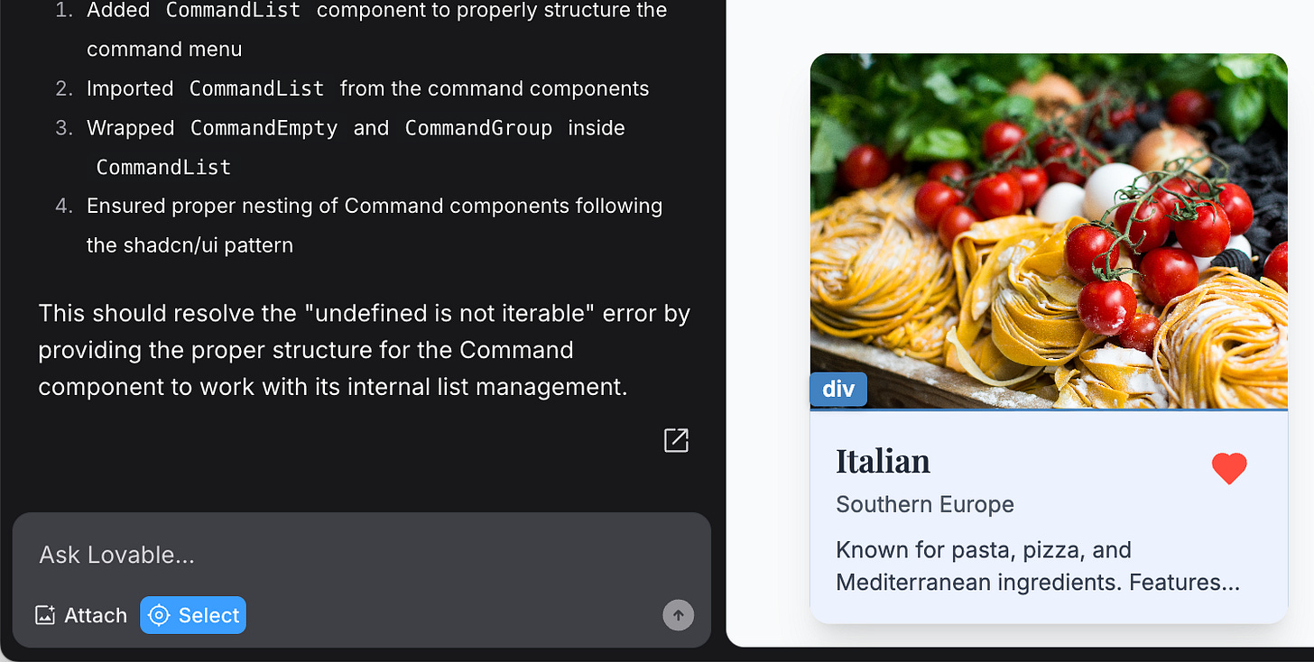 选择元素功能:在Lovable中,你可以直接从预览中选择一个元素,并在聊天消息中引用它进行修改。这个不常被讨论的功能通过将你的反馈直接链接到UI元素,使迭代设计调整更加直观。
