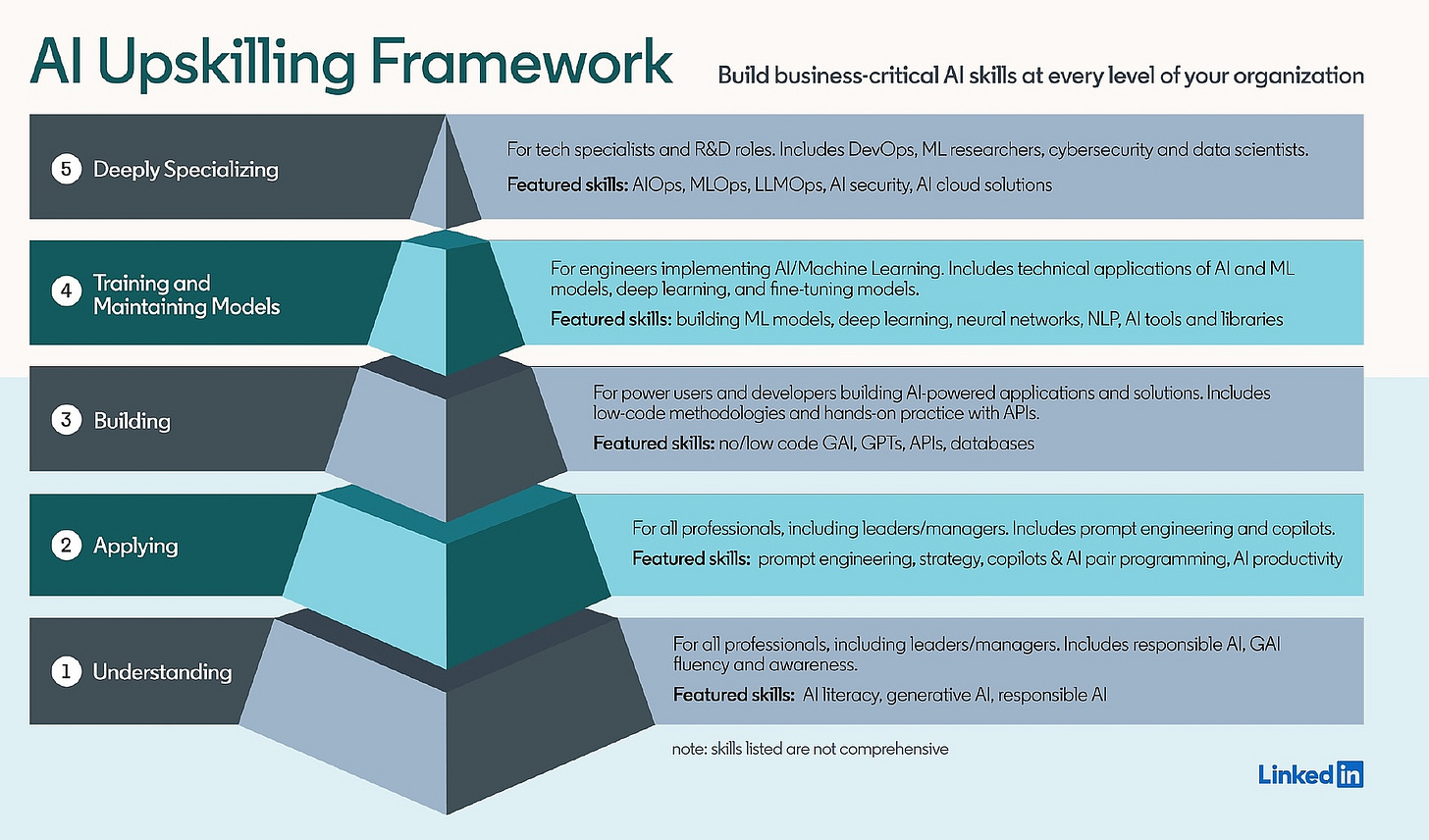 在我的团队中,我们让各级管理者/总监/副总裁和技术负责人在理解、应用和构建方面提升技能,并指导 IC(个人贡献者)做同样的事情。我倾向于建议只有在实际构建 AI 功能或直接与模型团队合作时,才需要了解训练/模型专业化。